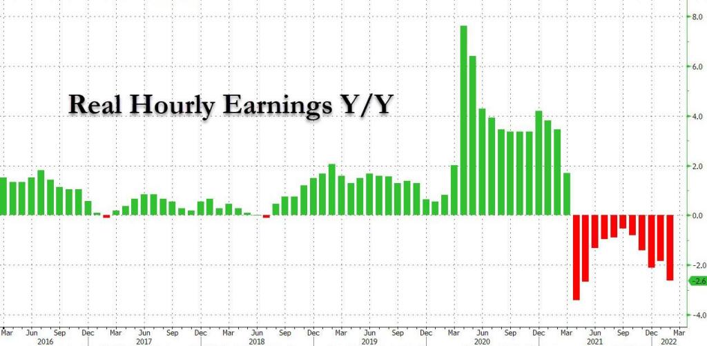 Todo esto en medio de un frenesí de aumentos de precios (7.9%) llegó a un nuevo máximo de 40 años. Muchos no se distrajeron con los datos de salarios nominales aumentando, el salario real –ajustado en base a la inflación– no ha logrado mantener el ritmo del incremento de los precios durante 11 meses consecutivos, y en febrero el valor hora se contrajo un 2,6% en comparación con el año anterior. Este número empeorará mucho el próximo mes cuando el impacto total del mayor shock de suministro de energía desde la crisis del petróleo de la década de 1970 llegue al frente y al centro. En todos los niveles de ingresos, solo el 18 % de los consumidores dijo que sus salarios estaban a la altura del costo de vida más alto.