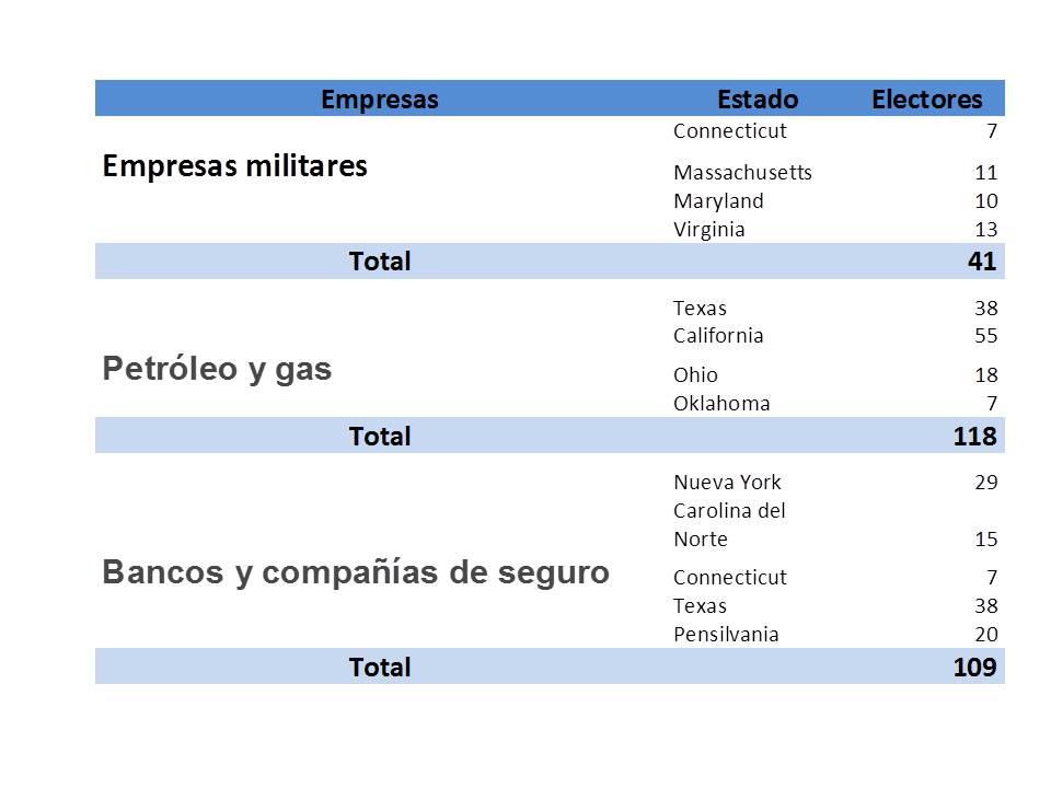 Cada uno de los complejos de poder ha diversificado ampliamente sus fábricas y empleos en casi todos los estados, especialmente en los distritos donde se eligen los jefes de los comités clave del Congreso. Los electores son 538 y se ve cómo están distribuidos con minuciosidad en el país.