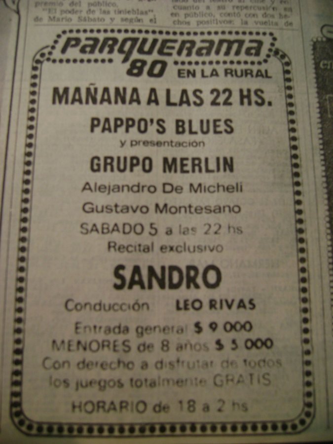 Pero no fue la primera presentación del grupo. Ya venían tocando. En febrero de ese año fueron convocados para lo que fue la serie de presentaciones organizadas por la propia compañía discográfica, «Parquerama 80«, en la Rural, con conciertos todos los viernes del mes. Allí tocarán, entre otros, Seru Giran, Raúl Porchetto, Nito Mestre, Miguel Ángel Erausquin, Pappos’s Blues, obviamente, nuestros amigos de Merlín. La banda del Carpo y la de Alejandro y Gustavo serían las encargadas de animar el primer show.
