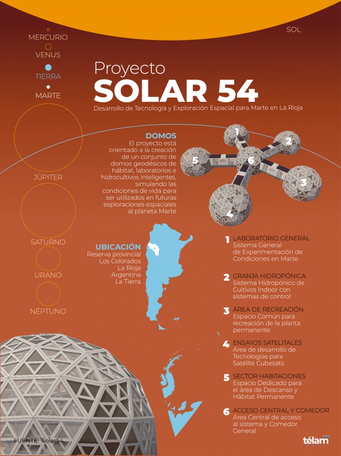 Solar54 es un proyecto fomentado y llevado adelante por el gobierno de La Rioja para reproducir las condiciones de Marte. Fue presentado en la feria internacional Satellite DC, en Washington, EEUU, y consiste en seis domos para entrenamiento de científicos y astronautas. La base será la primera en Latinoamérica y la 11ª en el mundo.
