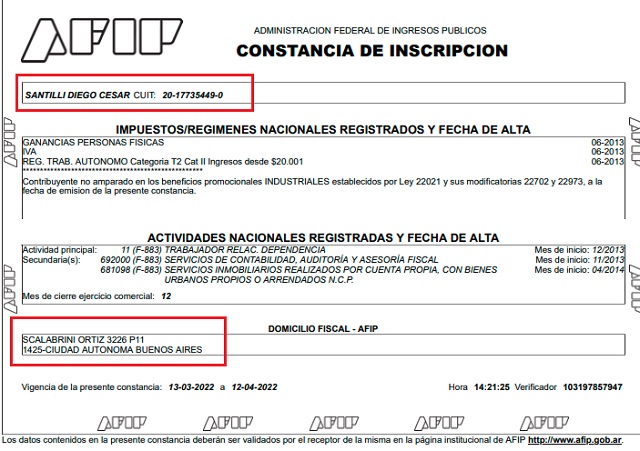 Esta offshore tiene registrada su dirección en la calle Scalabrini Ortiz 3226, Piso 11º, Barrio Palermo, CABA. Domicilio particular de la familia Santilli, donde la tarotista cheek vive con su esposo, el empresario, ex presidente de River y ex-funcionario de Carlos Menem, Hugo Cesar Santilli, procesado por corrupción. Y es la misma dirección fiscal que tiene registrada ante la AFIP como monotributista su titular María Luisa Forchieri, y su hijo el diputado Diego Santilli, en su monotributo como contador, cuya constancia de inscripción puede verse abajo.