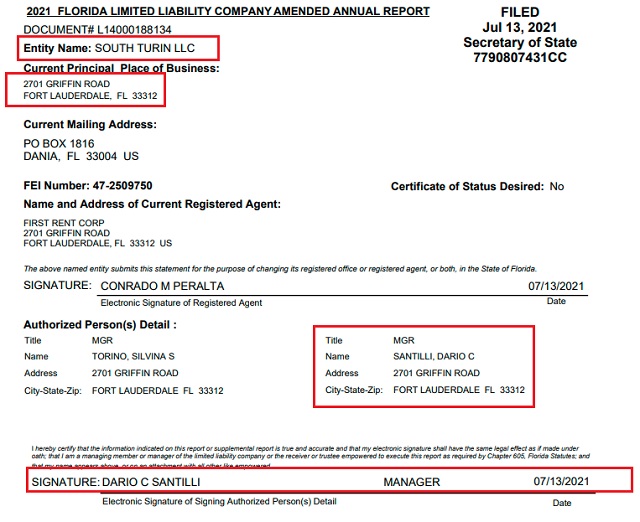 Se trata de South Tourin LLC. Otra SRL dedicada al servicio de alquileres plenamente activa. Esta otra offshore fue creada el 9 de diciembre del 2014, un año antes que asuma Macri la presidencia, por una tal Silvia Torino con el número de registro L14000188134. Su dirección es en la calle Griffin Road Fort Lauderdale 2701, Miami. Y su directorio, como se puede ver en los documentos publicados por el Departamento de Estado de Florida, -https://dos.myflorida.com-, lo integran Darío Santilli, empresario y actual Pro Secretario del club River, Silvina Torino, y el representante de la compañía First Rent Corp. Empresa a cargo de un tal Conrado Peralta, que a su vez maneja otras decenas de offshore. Todas en la misma dirección Griffin Road Fort Lauderdale 270, Miami, Estados Unidos.