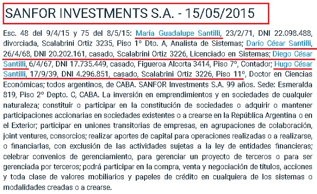 En cuanto a Sanfor Investments S.A. dedicada a la construcción de edificios e inversiones financieras, del cual Diego Santilli dice ser el dueño de la mitad de las acciones, se creó el 15 de mayo del 2015. Poco antes de que Macri asumiera la presidencia. La integra toda la famiglia Santilli: Hugo, Diego, Darío y Guadalupe. Menos la madre tarotista María Luisa Forchieri. Dueña de la offshore Lakerise Internacional Limitada.