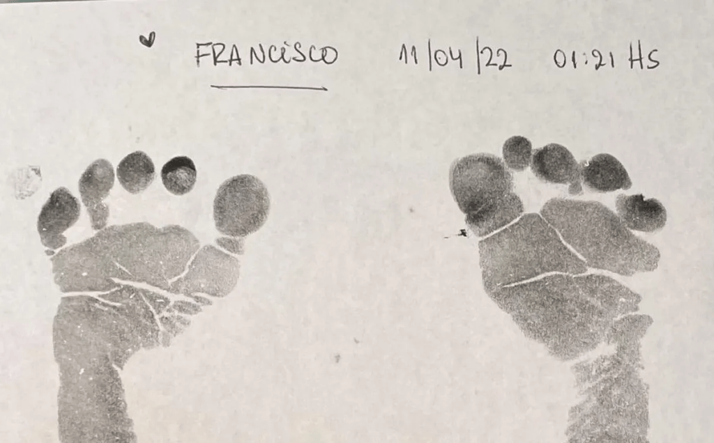 El jefe de Estados adjuntó una fotografía que muestra las huellas de las plantas de los pies del pequeño. En letra imprenta, se lee también el nombre “Francisco”, la fecha de nacimiento (11/04/22) y el horario (1.21).