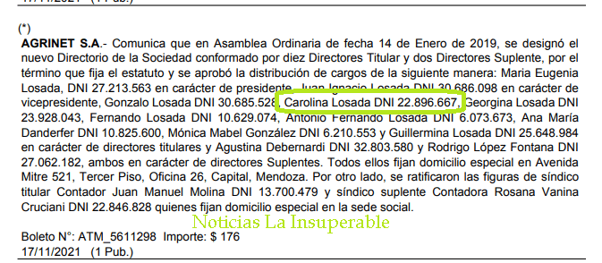 Y es que «los Losada» son dueños de numerosas empresas, entre las que podemos mencionar a AGRINET S.A., donde nuestra Carolina es Directora Titular, según indica el Boletín Oficial de la provincia de Mendoza del pasado 17 de noviembre de 2021.
