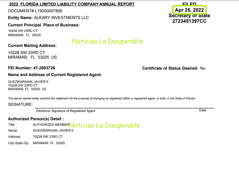 Pero ahora el economista intenta tapar sus huellas de salida de capitales hacia el exterior; por este motivo dieron orden a su apoderado, Javier Guezikaraian, de borran los rastros. Así las cosas, en el día de ayer, 25 de abril de 2022, ALKARY INVESTMENTS LLC presentó su nueva Declaración Jurada anual, pero esta vez tomaron la precaución de que no aparezca ningún Milei y mudaron el domicilio.