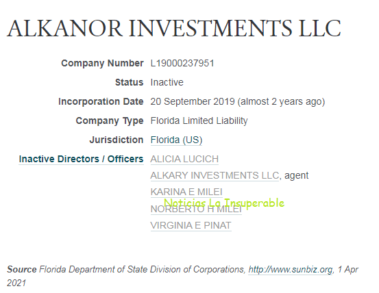 En septiembre del año pasado, desde Noticias La Insuperable, te dimos la primicia sobre las offshores familiares de los Milei en Miami. ALKARY INVESTMENTS LLC fue creada a principios de 2015 y en ella figuran como directores los millonarios padres de Javier, Norberto Horacio Milei y Alicia Luján Lucich, así como su hermana y mano derecha de campaña Karina Elizabet Milei.