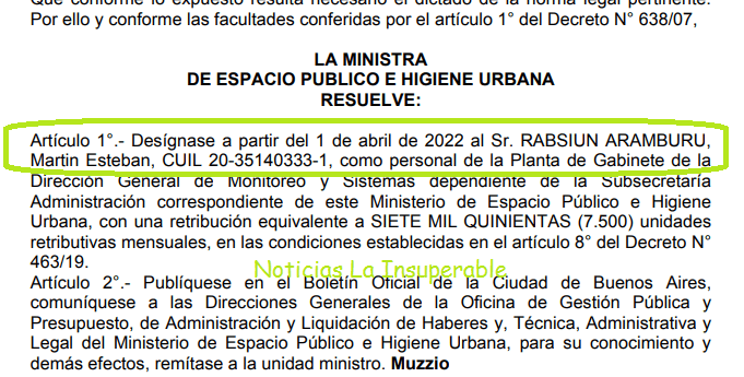 Y la semana pasada, gracias a la RESOLUCIÓN N.º 372/MEPHUGC/22, firmada por la ministra Clara Muzzio, se lo incorporó como Personal de Planta con un sueldo de 260.000 pesos.