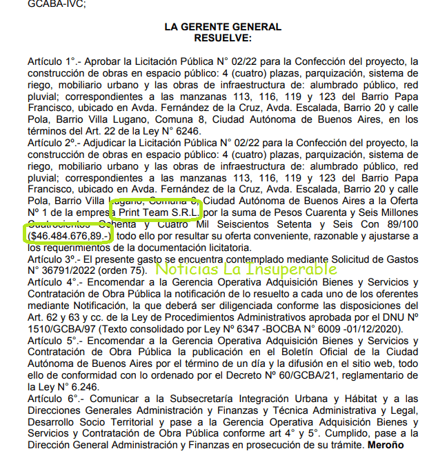 Julieta Meroño, Gerenta General del Instituto Nacional de la Vivienda de la Ciudad (IVC), aprobó en estos días, a través de la RESOLUCIÓN N.° 379/IVC/22, la Licitación Pública N° 02/22 para «la Confección del proyecto, la construcción de obras en espacio público: 4 (cuatro) plazas, parquización, sistema de riego, mobiliario urbano y las obras de infraestructura de: alumbrado público, red pluvial; correspondientes a las manzanas 113, 116, 119 y 123 del Barrio Papa Francisco, ubicado en Avda. Fernández de la Cruz, Avda. Escalada, Barrio 20 y calle Pola, Barrio Villa Lugano, Comuna 8» en CABA.