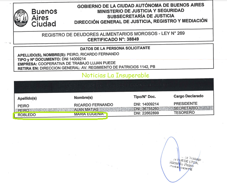Pues bien, para confirmar el «tongo» y ver que Print Team y esta firma disfrazada de cooperativa son exactamente lo mismo, y logran sus contratos con la anuencia del IVC larretista, vemos en documentos oficiales que la tal Robledo no es otra que la Tesorera de la COOPERATIVA DE TRABAJO LUJAN PUEDE LTDA.