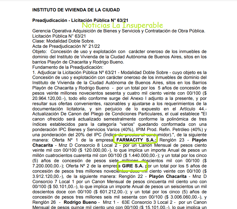 El Instituto de la Vivienda de la Ciudad (IVC), a través de la firma de su Gerenta General, Julieta Meroño, confirmó la preadjudicación de la Licitación Pública N° 63/21, que tiene como objeto la concesión de uso y explotación con carácter oneroso de locales comerciales de dominio del IVC, sitos en los Barrios Playón Chacarita y Rodrigo Bueno. Y como era de esperarse, los grandes ganadores fueron los de siempre.