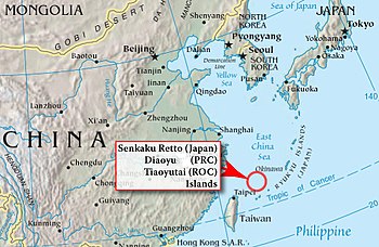 Las Islas Senkaku (así llamadas por los japoneses) o Diaoyu (por los chinos) son un archipiélago de ocho islas y peñascos bajo control japonés, que son reivindicados por Taiwán y por la República Popular de China.