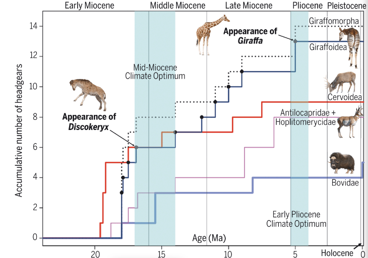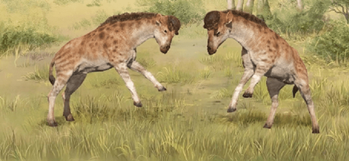 A partir del análisis de los restos fósiles de un antiguo antepasado de las jirafas, llamado Discokeryx xiezhi, del Mioceno temprano (hace ~ 16,9 millones de años) localizados en el norte de China, un equipo de investigación suizo-chino, a concluido que las características morfológicas del cuello-cabeza de las jirafas se desarrollaron para aumentar sus posibilidades de apareamiento.