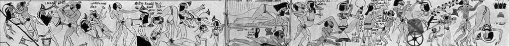 Las sátiras parecen ser sencillas: los animales participan en actividades humanas que van desde tocar el arpa hasta librar la guerra, incluido un gato coronado de loto que hace el amor con un ganso. Este tipo de representaciones se pueden encontrar ocasionalmente en tumbas y decoraciones y parecen haber divertido a los antiguos egipcios.