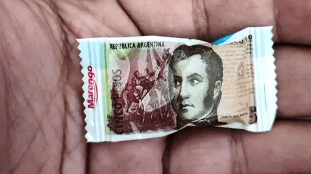 El viejo hábito de dar el vuelto en caramelos ya tiene forma propia. La empresa santafesina Marengo S.A. lanzó los Caramelos Duros Ácidos Surtidos “Billetes” Marengo que vienen en un empaque rectangular que, de un lado, muestra la imagen del retirado billete de 5 pesos con la efigie de José de San Martín y, del otro, la frase “Gracias por su compra” en medio de los colores de la bandera argentina.