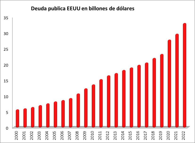 Pero el propio mito y su Estado profundo se metieron en problemas. Estados Unidos tiene más de U$S 33 billones en deuda. Con estos niveles, cada 1% de aumento en las tasas significa U$S 330.000 millones adicionales en pagos de intereses, o sea, casi un 80% del PBI argentino en intereses. Ya pagaba U$S 305.000 millones de intereses por año cuando las tasas estaban en cero. Ahora están al 1%, y la Reserva Federal afirma que los subirá al 3.5%, o quizás más. Esto significaría que los EEUU gastarían casi U$S 1 billón por pagos de intereses sin reducir ni un centavo su deuda. Más otros U$S 2 billones de déficit comercial anual.