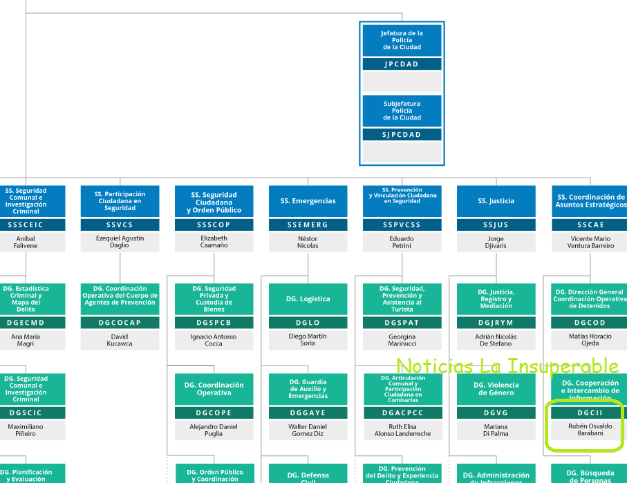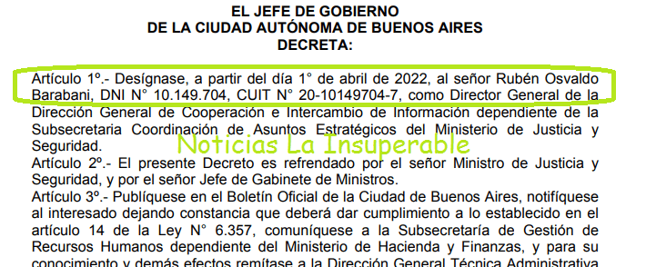 Según el DECRETO N.º 208/22 fechado el pasado 14 de junio y firmado por Horacio Rodríguez Larreta, el jefe de Gabinete porteño, Felipe Miguel y el ministro de Justicia y Seguridad de CABA, Marcelo D’Alessandro, Rubén Barabani fue designado, con fecha 1º de abril, como Director General de la Dirección General de Cooperación e Intercambio de Información dependiente de la Subsecretaria Coordinación de Asuntos Estratégicos del Ministerio de Justicia y Seguridad.