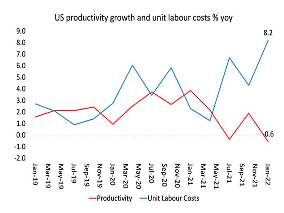 Michael Robert, en su artículo “Las tijeras de la depresión” explica que la productividad por trabajador se ha derrumbado, debido a que la tasa de crecimiento ya era débil. Como resultado, los costes laborales unitarios (costes salariales por unidad de producción) han aumentado, lo que estaría reduciendo los márgenes de beneficio. La solución: inflación para derrumbar los valores de los salarios y aumentar los márgenes de ganancia. Esto es aplicable a ambos países como punto central para que existan bajos niveles de desempleo, pero con salarios de pobreza.