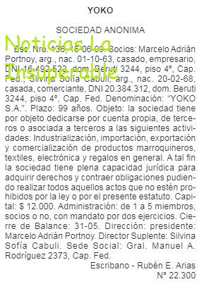 Yoko es una empresa creada a mediados de 1999 por los cónyuges Marcelo Adrián Portnoy y Silvina Sofía Cabuli, para dedicarse al rubro marroquinero.