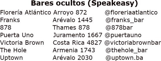 Los bares ocultos (Speakeasy) y semi-ocultos, inspirados en la Ley seca norteamericana, siguen siendo una opción de la coctelería porteña. Ya no son novedad, pero conservan su atractivo. Con más o menos complicaciones para ingresar, son un secreto a voces. Sea como fuere, hay que consultar en sus redes -suelen preferir Instagram- si es necesario reservar o invocar determinada contraseña.