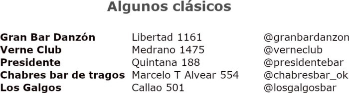 De vuelta están, por otro lado, vermuts, aperitivos y amaros. A la italiana, a la francesa, artesanales o a la criolla, andan por todas partes. El fernet, ya sabemos, no se le niega a nadie; criticar un Fernandito equivale a herejía. En los bares que se precian de ser ahora no faltan ni el Pineral ni la Hesperidina ni el Punt e Mes, mucho menos los queridos rossos. Al Amargo Obrero suele vérselo también. El Cynar pasó a ser un indiscutible. Hasta podemos toparnos con una que otra vermutería bien puesta en el lugar menos pensado, que casi siempre es Palermo.
