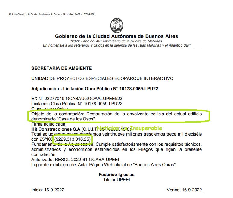 Ahora bien, hoy mismo, el Boletín Oficial porteño nos informa, a través del Titular de la Unidad de Proyectos Especiales Ecoparque Interactivo, Federico Iglesias, que el mismo gobierno porteño acaba de adjudicar la Licitación Obra Pública N° 10178-0059-LPU22, cuyo objeto es la «Restauración de la envolvente edilicia del actual edificio denominado «Casa de los Osos».«. La «envolvente edilicia» son los elementos exteriores de un edificio, incluyendo el techo, que forman la ‘piel’ que ofrece protección del clima exterior.