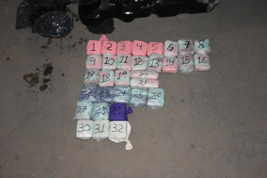 Con el apoyo del can antinarcóticos “Minos”, el cual marcó la presencia de estupefacientes en el sector de los estribos del rodado, los gendarmes detectaron tornillos recientemente removidos en el área del tanque de combustible, donde se ocultaban 32 paquetes amorfos de distintos tamaños, que contenían una sustancia pulverulenta blancuzca.