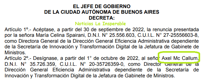 Y ahora, como broche de oro, a través del DECRETO N.º 338/22, el mismo Larreta acaba de nombrarlo como Director General de la Dirección General Eficiencia Administrativa dependiente de la Secretaría de Innovación y Transformación Digital de la Jefatura de Gabinete de Ministros.