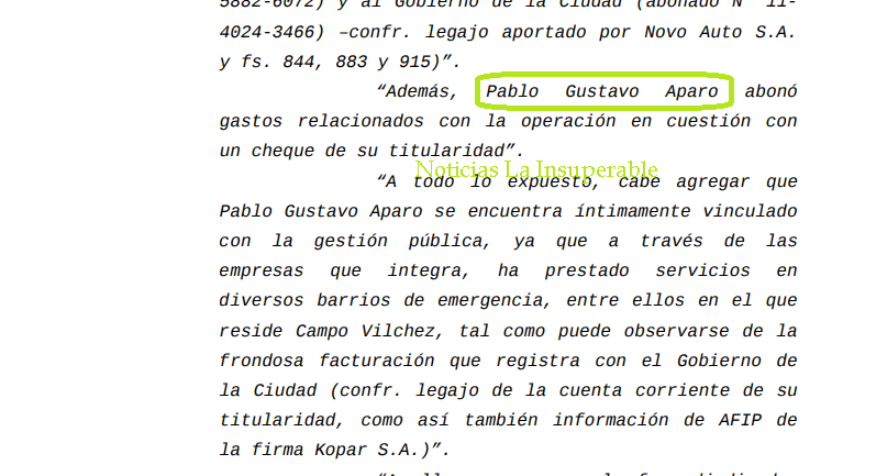 En primer lugar, la estrecha relación entre la ciudadana peruana, la inmobiliaria «Santos Caracoles» y la compra de un vehículo Fiat 500 a los 7 días de constituida ésta, con el empresario de la construcción Pablo Gustavo Aparo, quien «se encuentra íntimamente vinculado con la gestión pública, ya que a través de las empresas que integra, ha prestado servicios en diversos barrios de emergencia, entre ellos en el que reside Campo Vilchez, tal como puede observarse de la frondosa facturación que registra con el Gobierno de la Ciudad«.
