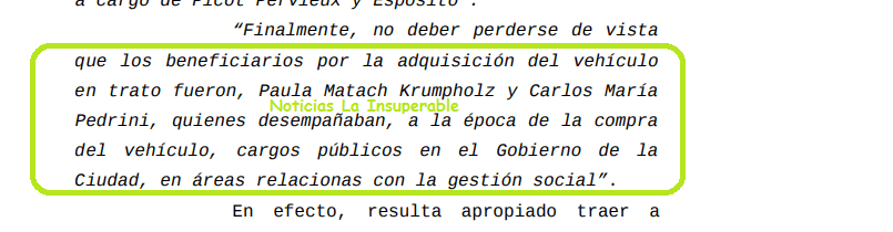 En su fallo, los jueces son muy claros, y recomiendan que «no deber perderse de vista que los beneficiarios por la adquisición del vehículo en trato fueron, Paula Matach Krumpholz y Carlos María Pedrini, quienes desempañaban, a la época de la compra del vehículo, cargos públicos en el Gobierno de la Ciudad, en áreas relacionas (SIC) con la gestión social«.
