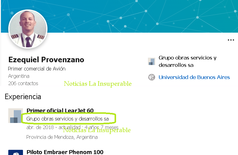 Ezequiel Provenzano es un joven piloto aeronáutico que, según su Linkedin, presta servicios desde hace más de 4 años para el Grupo Obras Servicios y Desarrollo, de la provincia de Mendoza.