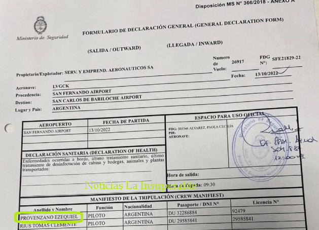 El listado surgió de la misma planilla de vuelo que se filtró en los medios, donde constaban los pasajeros mencionados. Pero hay un detalle no menor en la misma: los datos del piloto.