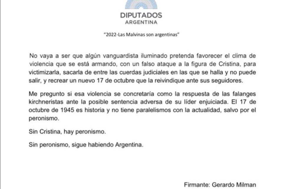 Allí, Milman, el que se reía en la mesa indicando que el estaría de viaje «cuando la maten», premonizaba un «falso ataque a la figura de Cristina, para victimizarla, sacarla de entre las cuerdas judiciales en las que se halla y no puede salir, y recrear un nuevo 17 de octubre«.