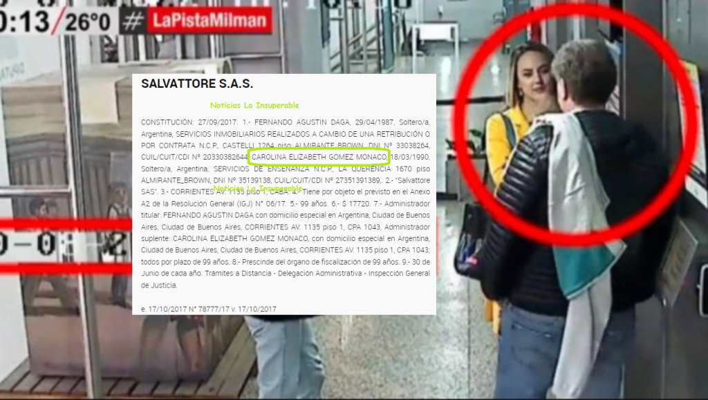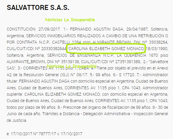 En simultáneo, el 29 de ese mismo mes y año, Gómez Mónaco constituyó una sociedad, SALVATTORE S.A.S., junto a Fernando Agustín Daga, inscripto como monotributista categoría F dedicado a brindar «servicios inmobiliarios», y vecino de su socia en Adrogué.