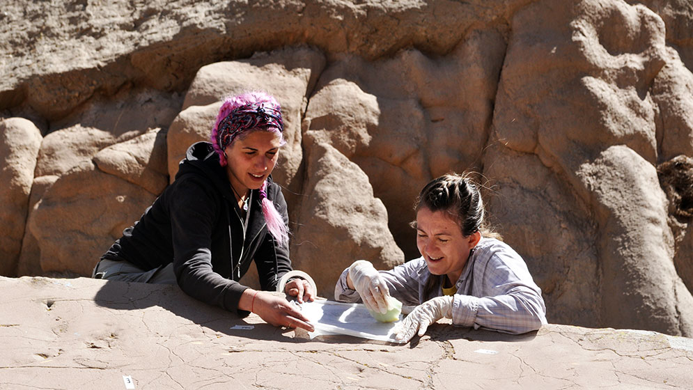 “Nuestra investigación se centra en el estudio de huellas fósiles de 10 millones de años de antigüedad producidas por mamíferos, más específicamente ungulados nativos extintos. Estos conformaban una diversa fauna completamente diferente a la actual que se originó hace aproximadamente 60 millones de años cuando Sudamérica era una gran isla. Eran animales que caminaban usando sus dígitos o dedos recubiertos por pezuñas y que tuvieron un gran éxito en términos de diversidad y abundancia durante el Mioceno”, afirma Rocío Vera, primera autora del trabajo, licenciada en Paleontología y becaria doctoral del CONICET en el Instituto de Estudios Andinos “Don Pablo Groeber” (IDEAN, UBA-CONICET).