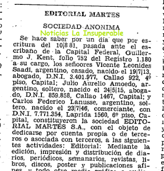 También fue socio de los Saadi. En 1981 conformó junto a Vicente Leónides Saadi, el ex gobernador de Catamarca, una sociedad comercial llamada «Editorial Martes SA». de la misma, también fue socio Julio Aurelio Amoedo, ex Senador catamarqueño y fundador del Partido Conservador Popular.
