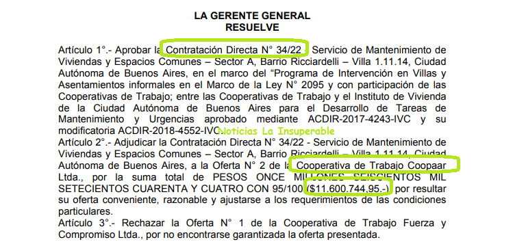 A través de la RESOLUCIÓN N.º 1167/IVC/22 fechada el pasado 22 de noviembre y publicada hoy en el Boletín Oficial, el Instituto de la Vivienda de la Ciudad (IVC), con la firma de su Gerenta General, Julieta Meroño, resolvió aprobar la Contratación Directa N° 34/22, cuyo objeto es el Servicio de Mantenimiento de Viviendas y Espacios Comunes – Sector A, Barrio Ricciardelli, de la Villa 1.11.14, y adjudicársela a «la Cooperativa de Trabajo Coopaar Ltda., por la suma total de PESOS ONCE MILLONES SEISCIENTOS MIL SETECIENTOS CUARENTA Y CUATRO CON 95/100 ($11.600.744,95.-)», desestimando, asimismo, otra oferta presentada por otra Cooperativa.