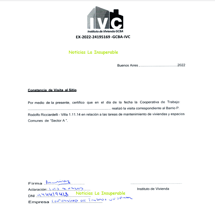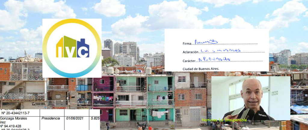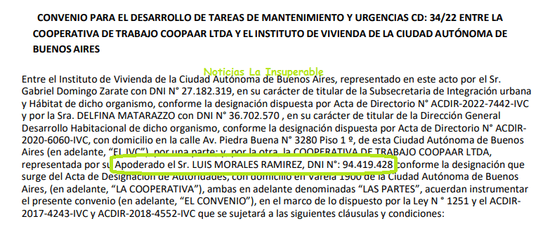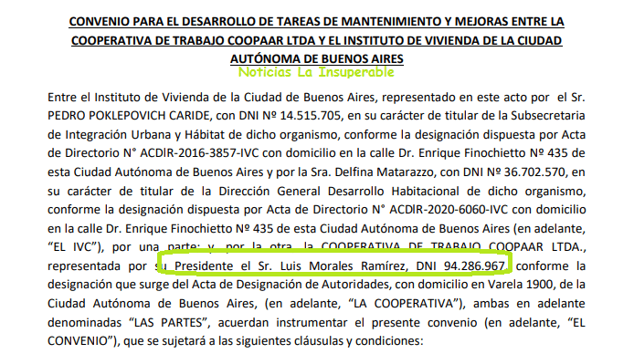 Fruto de la Contratación Directa, el IVC firma un convenio de trabajo con la Cooperativa. Por parte del gobierno porteño, rubrican el titular de la Subsecretaria de Integración urbana y Hábitat de dicho organismo, Gabriel Domingo Zárate, y la titular de la Dirección General Desarrollo Habitacional, también del IVC, Delfina Matarazzo, y por la Cooperativa, un ciudadano extranjero llamado Luis Morales Ramírez, en carácter de Apoderado.