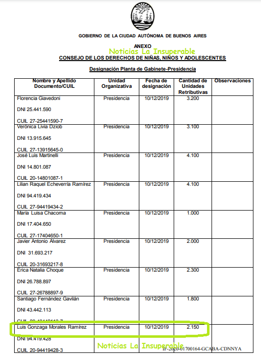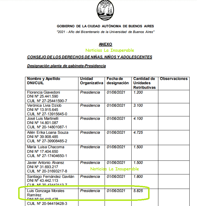 Lo curioso es que, quien firma como apoderado de dicha cooperativa, es un empleado del mismo gobierno de la Ciudad, siendo parte de la Planta de Gabinete, cumpliendo funciones en el área de Presidencia del Consejo de los Derechos de Niñas, Niños y Adolescentes, al menos desde el 2019.