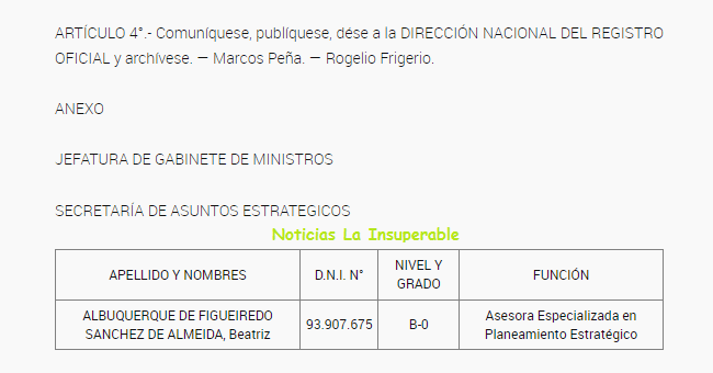 Según relata Juan Alonso, también encontramos a Andrea Karina Zakin, quien estuvo en el Ministerio de Seguridad junto a Patricia Bullrich como Auditora Adjunta de Articulación Operativa y cobra 371.000 pesos, y a Beatriz Almeida Sánchez Albuquerque, una brasileña que hasta 2015 estuvo en la subsecretaría de Relaciones Internacionales de CABA.