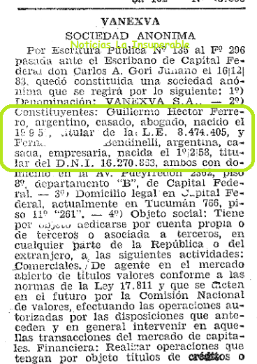 Y es que esta empresa, fue parte importante eslabón de la cadena de sociedades con que el dictador Emilio Massera padre blanqueó su fortuna mal habida. Tal cual cuenta la periodista Susana Viau, «Fernanda Ferrero refirió que había pertenecido a Vanexva entre 1988 y 1992, en calidad de relacionista pública. Era un remedo de la verdad. En realidad, Ferrero fue accionista fundadora de la extrabursátil, cuyo origen se ubica en los días en que el Almirante Cero comenzó a poner las barbas en remojo y algo de orden en sus cuentas, previendo posibles acciones del nuevo gobierno democrático«.