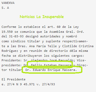 Diez años después, encontraremos a dos funestos personajes como miembros del Directorio de VANEXVA: Emilio Esteban y Eduardo Enrique Massera, hijos del genocida.