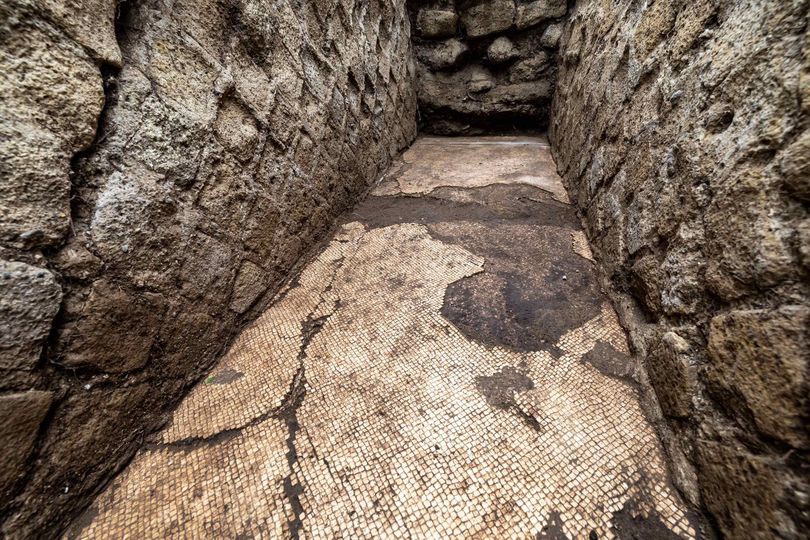 Un refinado piso de mosaico blanco con un doble marco negro para delimitar la sala de estar con vistas al mar de Nápoles, de dos mil años de antigüedad, cuando la fabulosa residencia pasó a manos de Augusto, fue descubierta en el suelo en la Villa Imperial de Pausilypon, cuyo primer propietario fue el rico y feroz caballero Publius Vedio Pollione, comerciante de vinos y político, cercano al emperador Augusto, que a menudo lo honraba con su compañía.