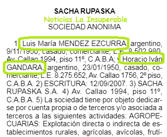 Según informan desde la IGJ, «la sociedad se constituyó en el año 2007 para dedicarse a la explotación agropecuaria, con un capital social mínimo de $ 12.000. Los fundadores fueron el anteriormente mencionado Luis María Méndez Ezcurra y el Sr. Horacio Iván Gándara, la cual, a los dos meses de inscripta, se incorporó el Sr. Luis Andrés Caputo como accionista mayoritario con el 60% de las acciones«, tal cual se desprende de la denuncia que encaró el ministerio de Justicia a través de la IGJ.