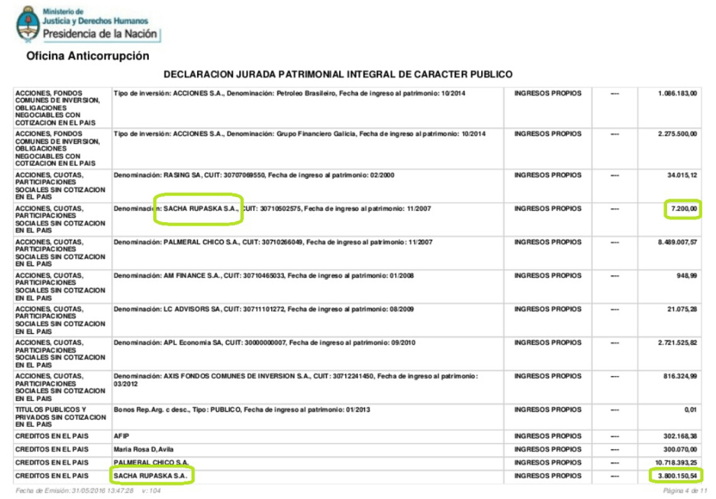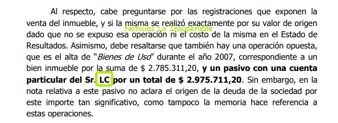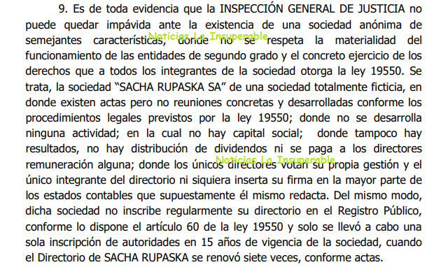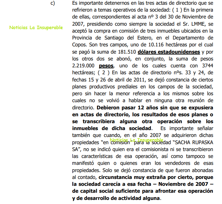 Al respecto, en la Resolución de la IGJ puede leerse que, cuando en 2007 se compraron los campos en Santiago del Estero, «se adquirieron dichas propiedades “en comisión” para la sociedad “SACHA RUPASKA SA”, no se indicó quien era el comisionista ni se transcribieron las características de esa operación, así como tampoco se manifestó quien o quienes eran los vendedores de esas propiedades. Solo se dejó constancia de que fueron abonadas al contado, circunstancia muy extraña por cierto, porque la sociedad carecía a esa fecha – Noviembre de 2007 – de capital social suficiente para afrontar esa operación y de desarrollo de actividad alguna«.