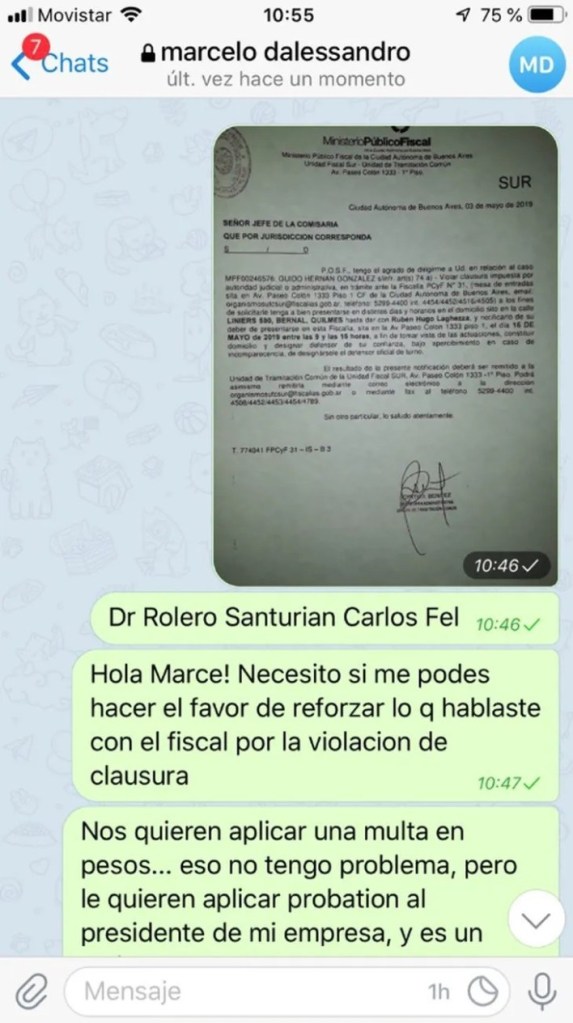 El 14 de junio de 2019, Violante le escribe a D’Alessandro para que medie ante Rolero Santurian, Fiscal Penal de la Ciudad Autónoma de Buenos Aires, para evitar una probation contra el presidente de su empresa (Rubén Hugo Laghezza) por violar una clausura. “Hola Marce, necesito si me podés hacer el favor de reforzar lo que hablaste con el fiscal por la violación de clausura. Nos quieren aplicar una multa en pesos. Eso no tengo problema… pero le quieren aplicar probation al presidente de mi empresa, y es un amigo. Se podrá solamente pagar la multa sin la probation?? Porque sino va a quedar el antecedente”.