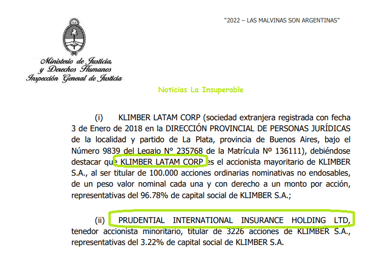 Por otro lado, desde la IGJ destacan que Klimber SA tiene dos accionistas, siendo KLIMBER LATAM CORP el mayoritario al ser «titular de 100.000 acciones ordinarias nominativas no endosables, de un peso valor nominal cada una y con derecho a un monto por acción, representativas del 96.78% de capital social de KLIMBER S.A.» El resto se encuentra en manos de PRUDENTIAL INTERNATIONAL INSURANCE HOLDING LTD.