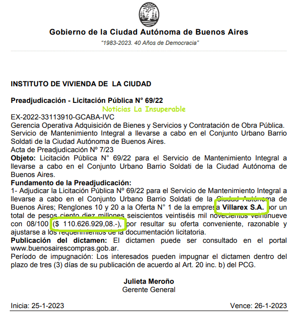 A través de su gerenta general, Julieta Meroño, el Instituto de Vivienda de la Ciudad (IVC) preadjudicó hoy la Licitación Pública N° 69/22 para el Servicio de Mantenimiento Integral a llevarse a cabo en el Conjunto Urbano Barrio Soldati de la Ciudad Autónoma de Buenos Aires.
