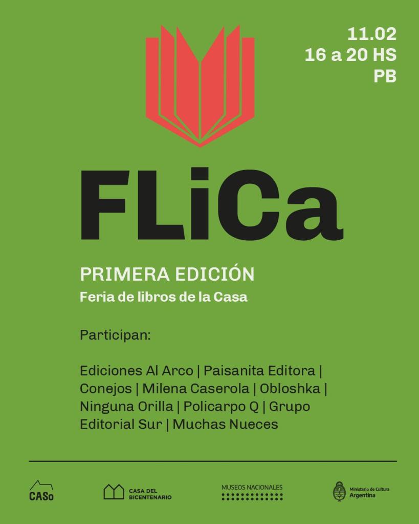 La Feria de Libros de la Casa (FLICA) se desarrolla por primera vez y su impronta inaugural será la de reunir diversas editoriales de literatura contemporánea. Participan: Ediciones Al Arco, Paisanita Editora, Conejos, Milena Cacerola, Obloshka, Ninguna Orilla, Policarpo Q, Grupo Editorial Sur y Muchas Nueces. FLICA se propone generar un espacio de intercambio entre editores y lectores para charlar de libros, llevarse algunos y leer leer leer. Su objetivo es instalar la voz editorial y promover la circulación de libros y autores acompañando el abanico de exposiciones temporarias y programas de música, teatro, danza y cine que elaboran conjuntamente las diversas áreas de la Casa Nacional del Bicentenario.