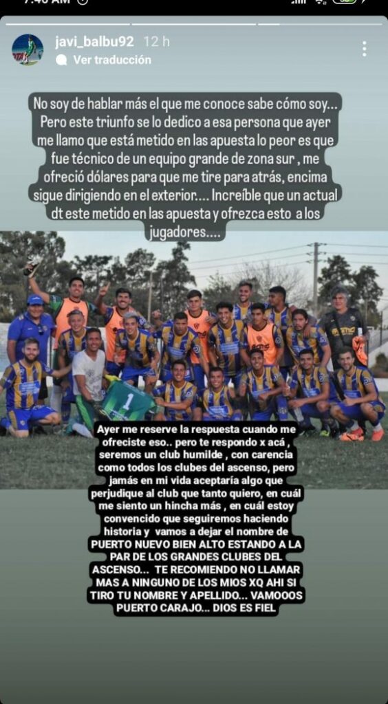 Con gol de Alex Penoni, Puerto Nuevo consiguió la primera victoria en el año ante Alem. Luego del triunfazo como visitante, Javier Balbuena decidió descargarse en sus redes sociales por un lamentable hecho sucedido en la previa de dicho encuentro. El arquero del conjunto de Campana reveló con una historia de Instagram que intentaron sobornarlo.